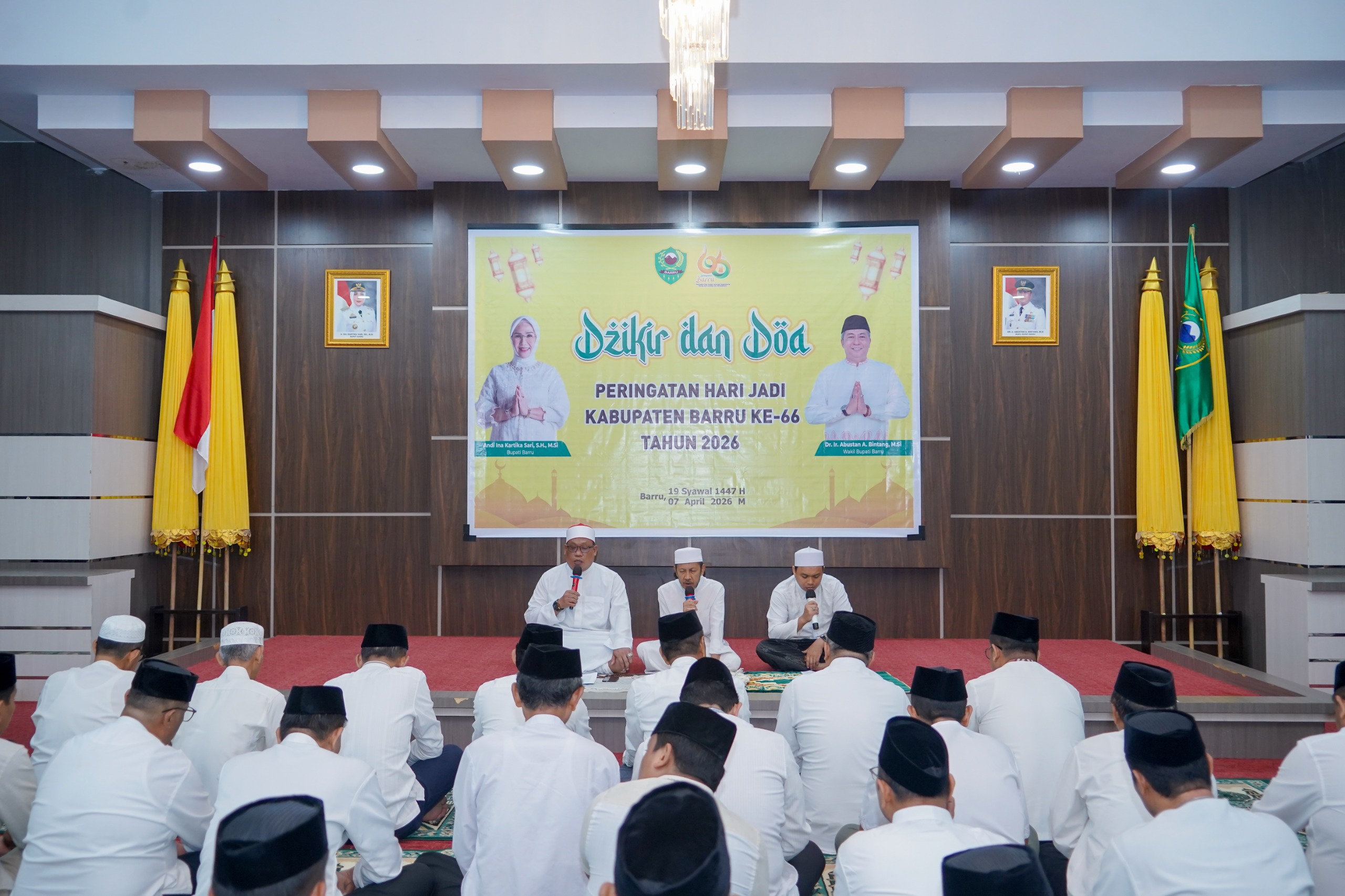 Barru, Menit7. Com — Suasana khidmat menyelimuti pelaksanaan dzikir dan doa bersama dalam rangka memperingati Hari Jadi Kabupaten Barru ke-66 Tahun 2026 yang digelar di Baruga Singkerru Adae, Rumah Jabatan Bupati Barru, Selasa malam (7/4/2026).