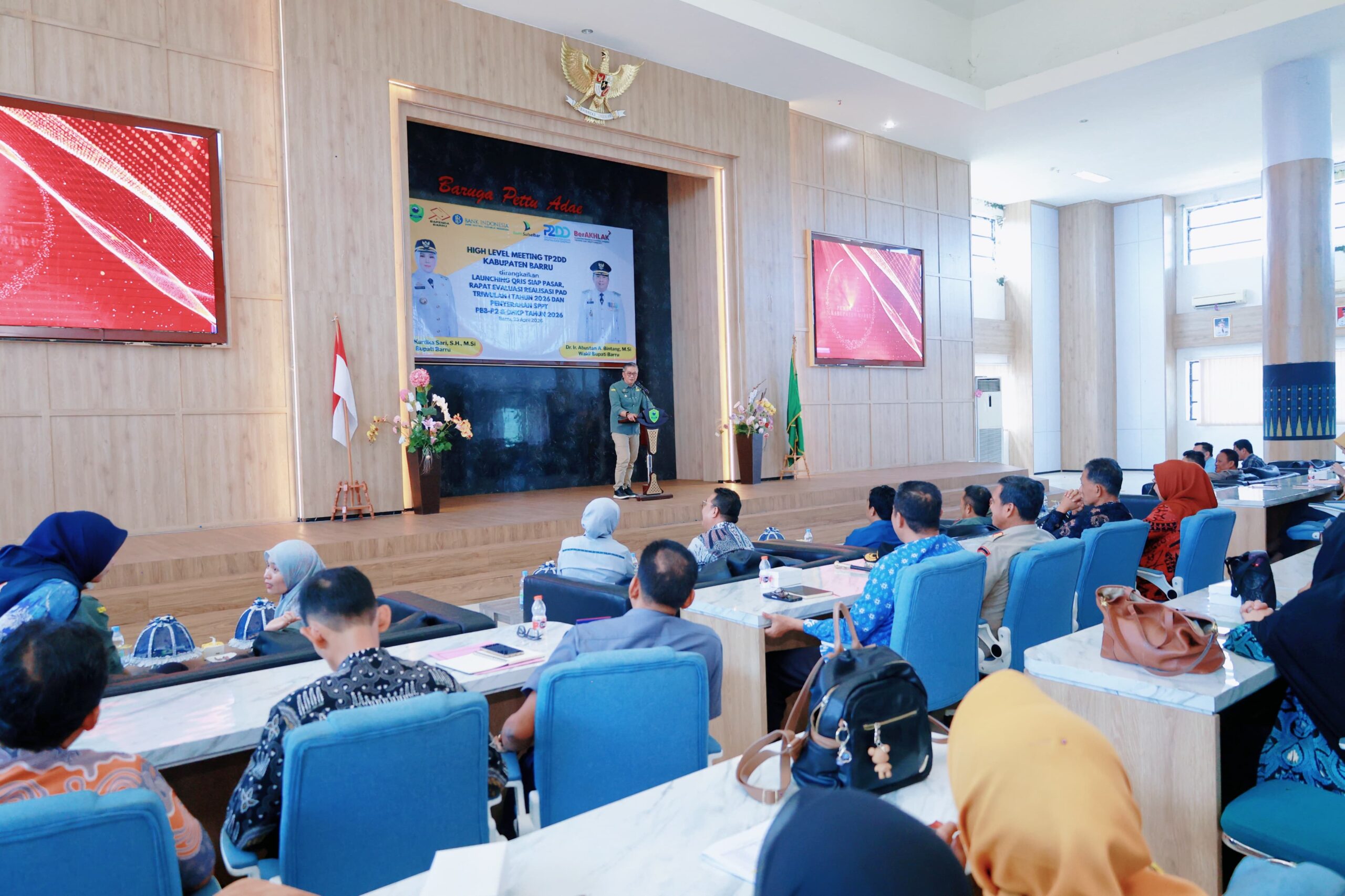 Barru, Menit7 Com – Mewakili Bupati Barru, Wakil Bupati Barru Abustan A. Bintang, membuka secara resmi membuka secara resmi High Level Meeting Tim Percepatan dan Perluasan Digitalisasi Daerah (TP2DD) yang dirangkaikan dengan Launching QRIS SIAP Pasar, Evaluasi Realisasi Pendapatan Asli Daerah (PAD) Triwulan I Tahun 2026, serta Penyerahan SPPT PBB-P2 dan DHKP Tahun 2026, di Lantai 6 MPP Kantor Bupati Barru, Kamis (23/4/2026).