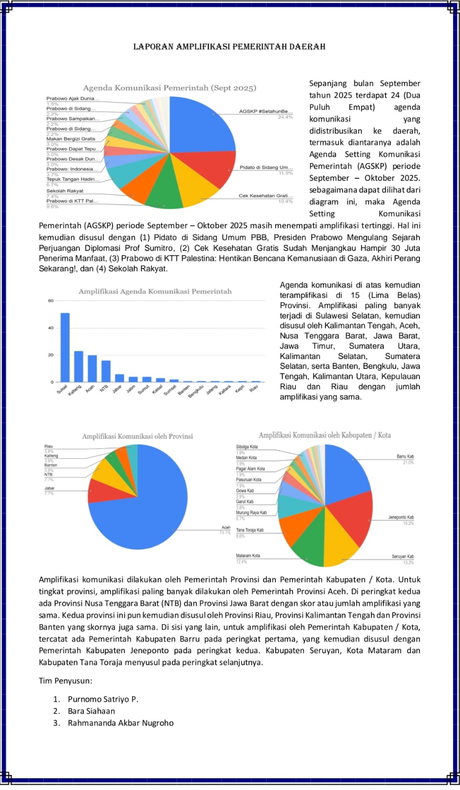 Laporan tersebut merupakan hasil rekapitulasi aktivitas komunikasi dan publikasi dari seluruh pemerintah daerah di Indonesia, baik di tingkat provinsi maupun kabupaten/kota. Penilaian dilakukan untuk mengukur sejauh mana daerah berperan aktif dalam menyebarluaskan informasi dan pesan strategis pemerintah pusat melalui berbagai kanal komunikasi mulai dari situs web resmi, media sosial, hingga media pemberitaan.