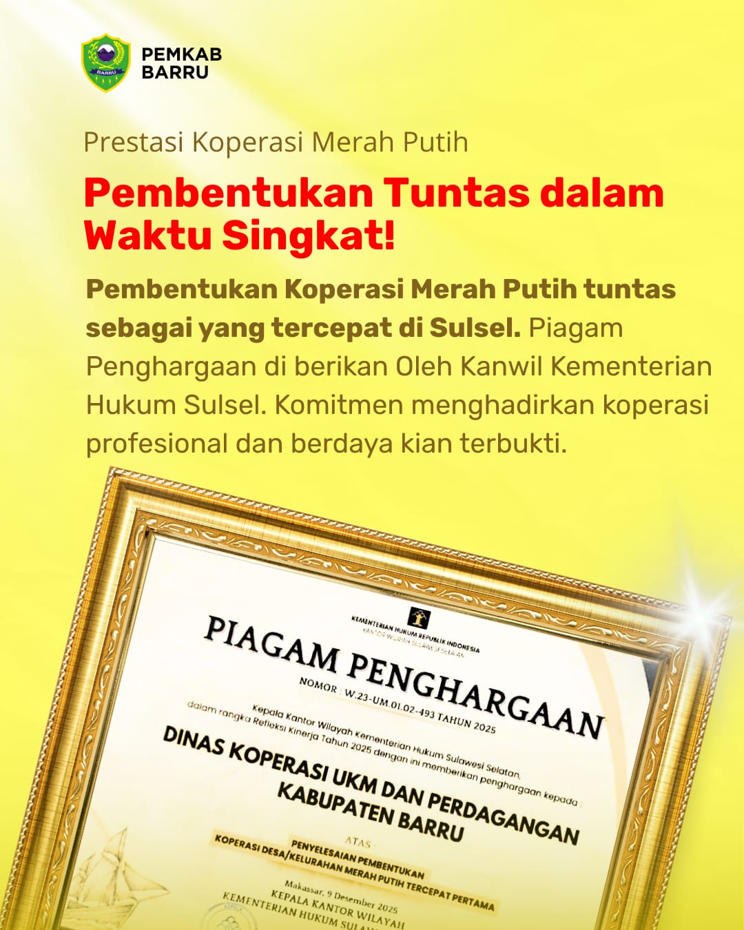 Keberhasilan ini mendapat apresiasi dari Kantor Wilayah Kementerian Hukum Sulawesi Selatan, yang menyerahkan Piagam Penghargaan kepada Pemkab Barru melalui Dinas Koperasi UKM dan Perdagangan Kabupaten Barru pada acara Peringatan Hari Anti Korupsi se Dunia di Makassar, Selasa 9/12/2025.