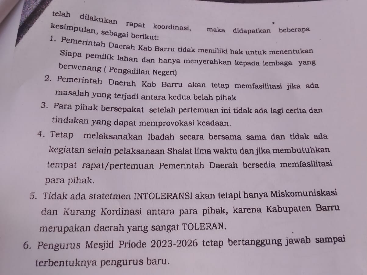 Enam poin hasil mediasi antara pengurus masjid nurut tajdid dengan PD Muhammadiyah Barru (dok. Istimewa)